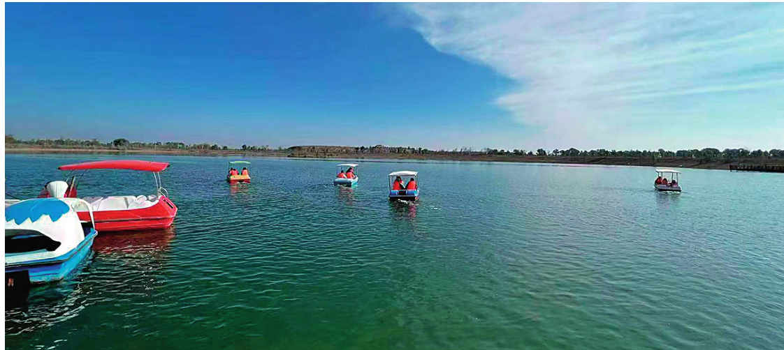 5月2日,在鹽池縣哈巴湖景區(qū)內(nèi),清風(fēng)拂面、水波蕩漾,游客乘船游玩,放松身心。記者 丁寶萍 金方華 攝