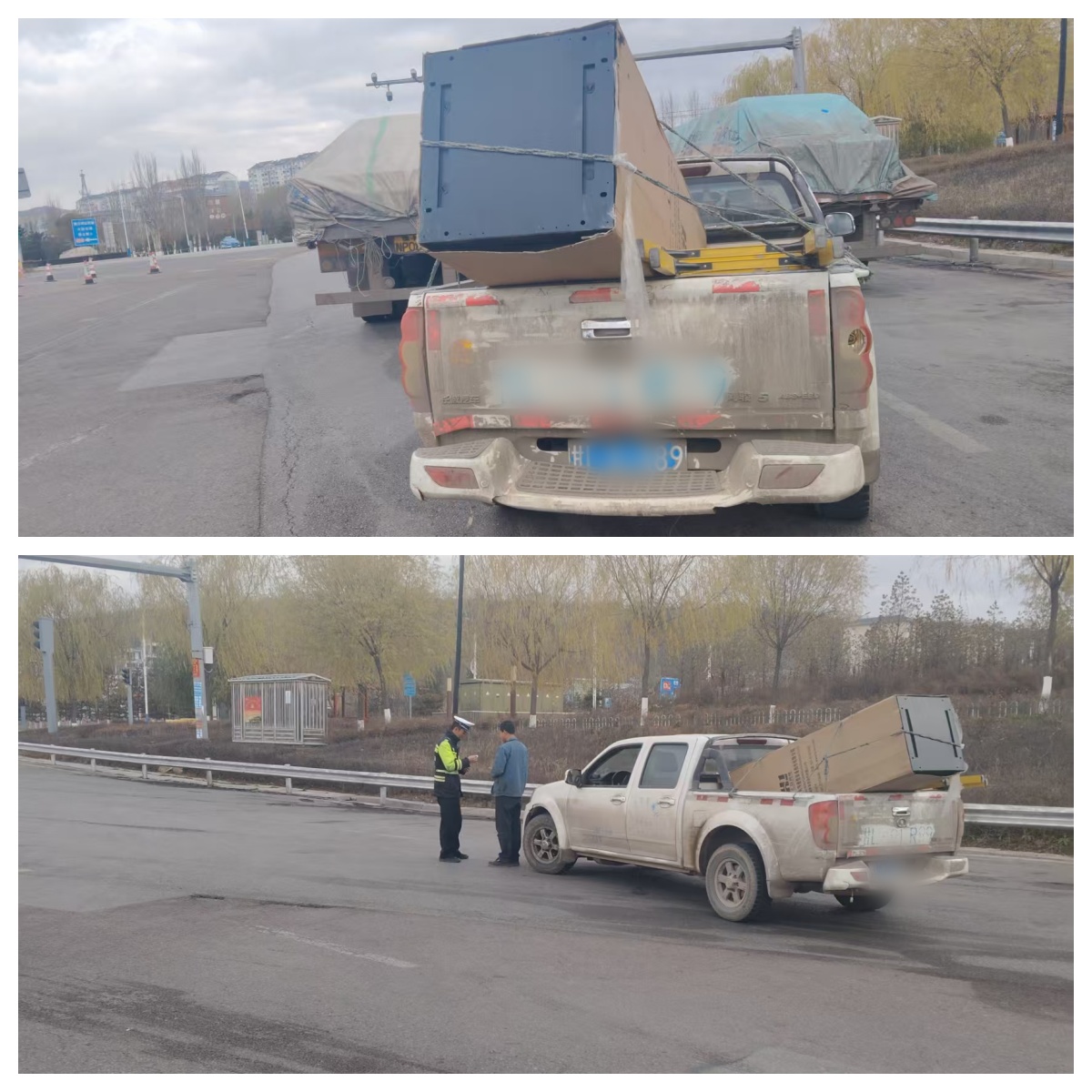 12月8日上午,大隊民輔警在青蘭高速隆德收費站執(zhí)勤點崗時,發(fā)現(xiàn)一輛拉載超長貨物的白色皮卡車緩慢從高速路口駛來,大隊民警見狀立即上前示意該車輛靠邊停車接受檢查。經(jīng)查,駕駛人員從平?jīng)鲑徺I了一個大型冰箱,為節(jié)約運輸成本,其將原本超長的冰箱裝載到自己駕駛的皮卡車上,沒想到在隆德高速路口被大隊民警查獲。民警當場對該駕駛人進行了嚴厲的批評教育,指出其違法行為所存在的安全隱患和危害性。駕駛人員對執(zhí)勤民警查獲的違法行為虛心接受并愿意接受處罰。最終大隊民警對駕駛人員違規(guī)拉載超長貨物的違法行為依法作出處罰,并責令駕駛人對車上的貨物進行卸載,安排合適車輛轉運貨物。