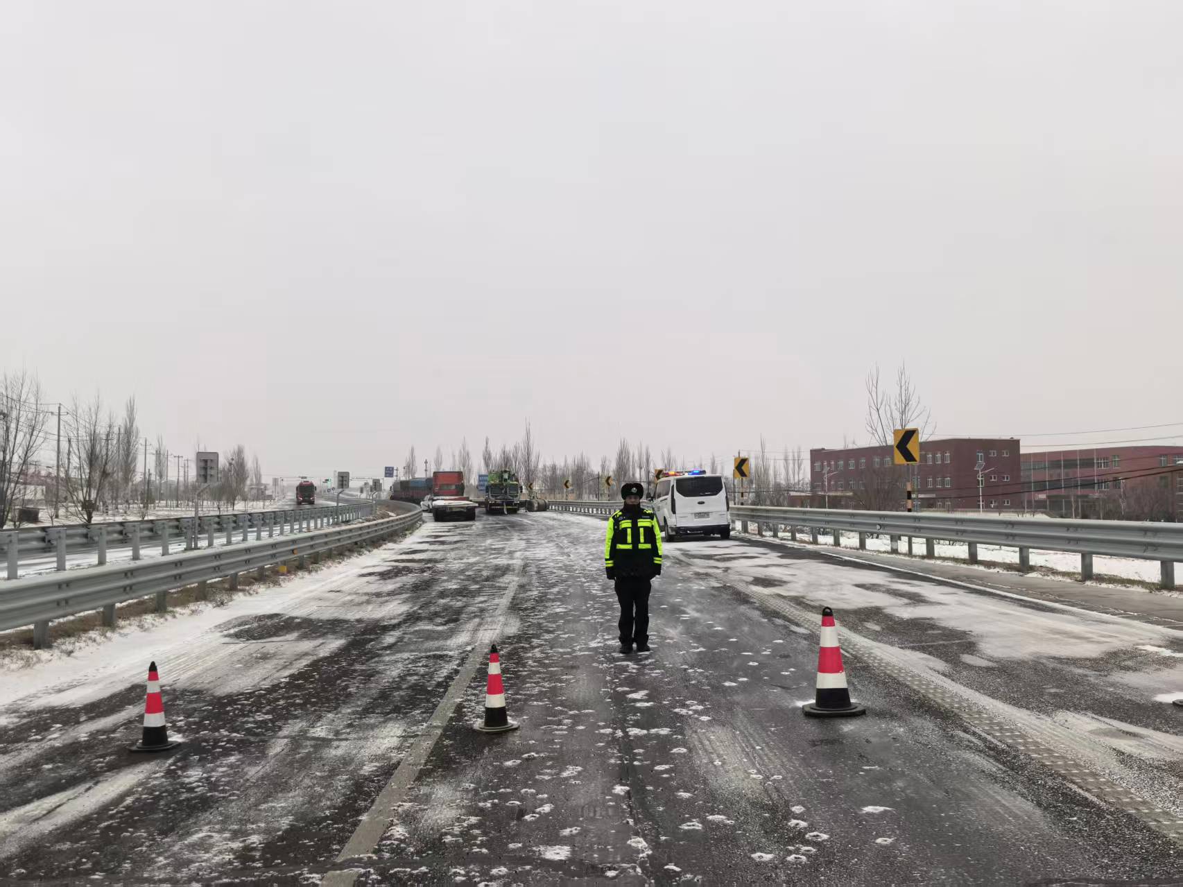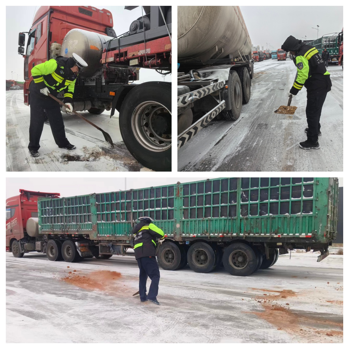 為保障道路通行順暢,大隊(duì)強(qiáng)化路面管控,聯(lián)合公路養(yǎng)護(hù)中心對(duì)轄區(qū)G344、338國(guó)道等重點(diǎn)路段施撒融雪劑、防滑沙,全力抗凝保暢。同時(shí),采取路面巡邏與固定崗位執(zhí)勤相結(jié)合的模式,在積雪結(jié)冰路段通過(guò)亮警燈、鳴警笛、喇叭喊話等方式,引導(dǎo)車輛有序通行,并反復(fù)提醒駕駛?cè)藴p速慢行、保持安全車距、謹(jǐn)慎轉(zhuǎn)彎剎車。