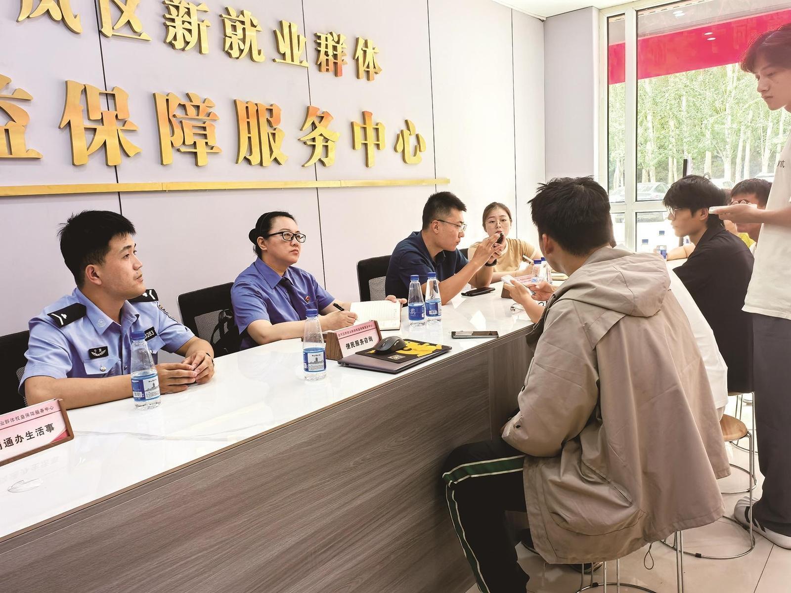 在金鳳區(qū)新就業(yè)群體權(quán)益保障服務(wù)中心,工作人員為新就業(yè)群體答疑解惑(7月10日攝)。