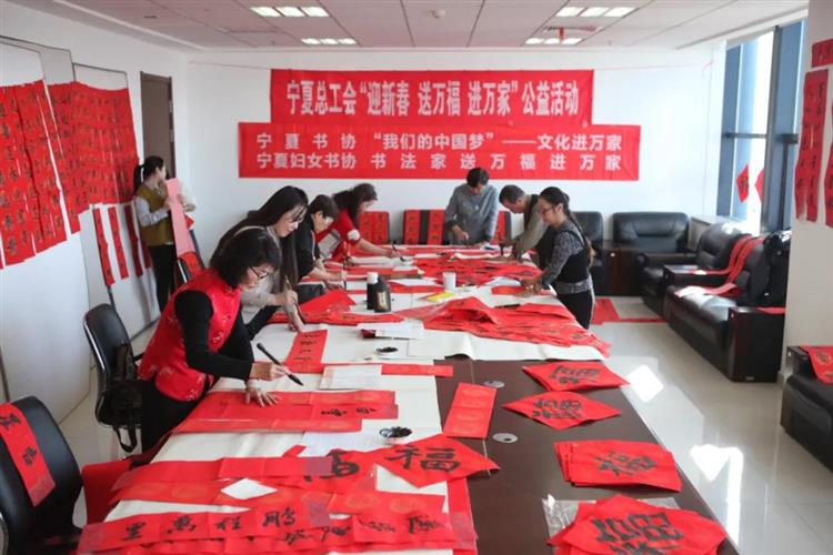 萬里晴空風(fēng)和煦,春風(fēng)送暖福臨門。1月14日下午,自治區(qū)總工會(huì)機(jī)關(guān)舉辦首場“迎新春 送萬福 進(jìn)萬家”公益活動(dòng),有幸邀請到寧夏婦女書法家協(xié)會(huì)主席喬華以及趙萍、趙彥、蘇詠梅、何軍菁等6名書法家現(xiàn)場創(chuàng)作對聯(lián)等書法作品500份。一個(gè)個(gè)厚實(shí)飽滿的“福”字、一副副氣韻生動(dòng)的春聯(lián),寄托著對新的一年美好的期盼和祝福,讓大家在感受喜慶的同時(shí)還體會(huì)到了中國書法的傳統(tǒng)文化魅力,濃濃的新年氣息撲面而來。
